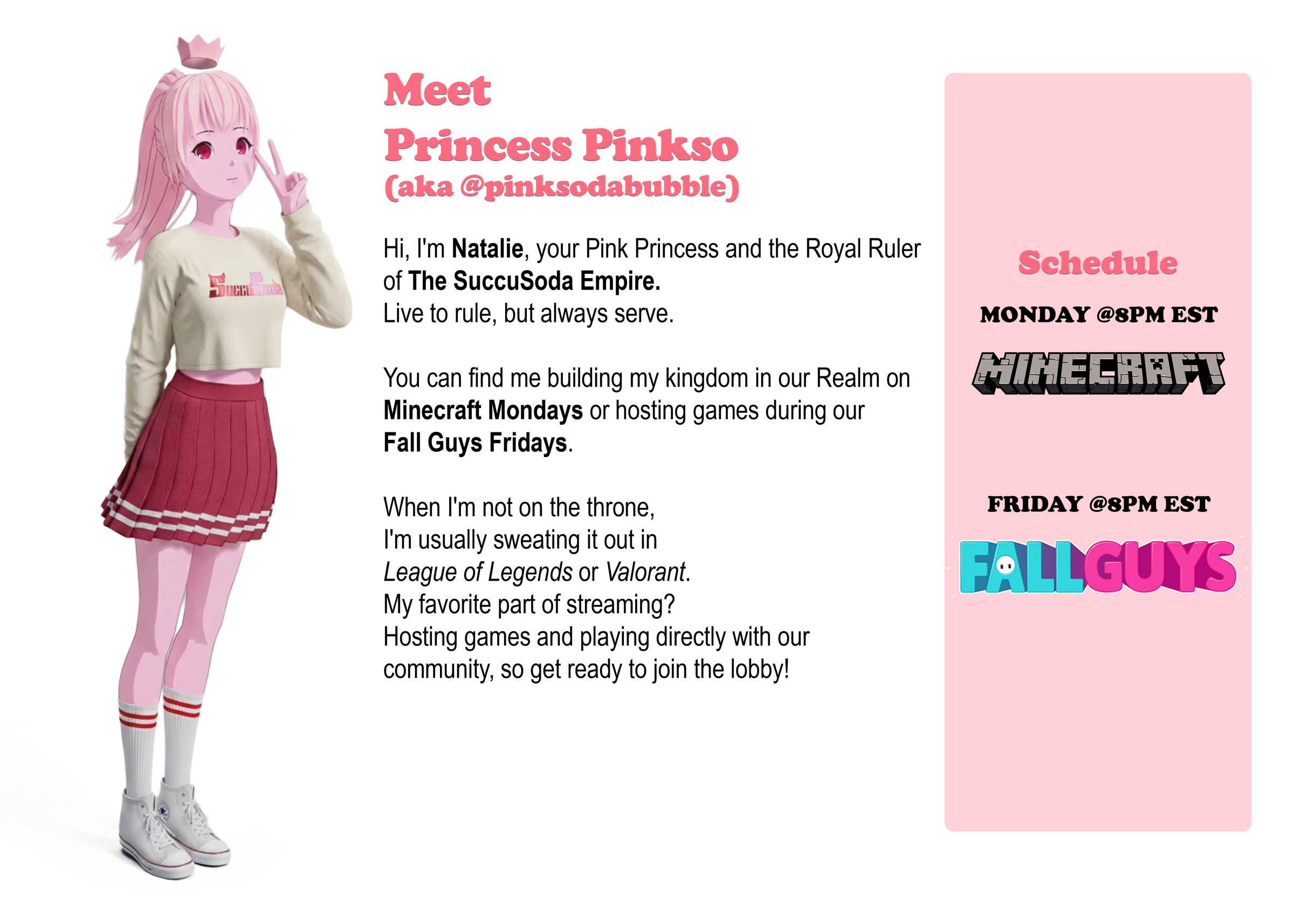 SuccuSoda is where the "SuccuBae" energy meets the "Princess" vibes, all surrounded in the world of gaming. Starting in the end of 2024 is when we placed our first brick into building our ever growing community. What drives us is the feeling of discovery and exploration while experiencing new adventures with one and another. We would love to have you join our empire and be a part of our journey.